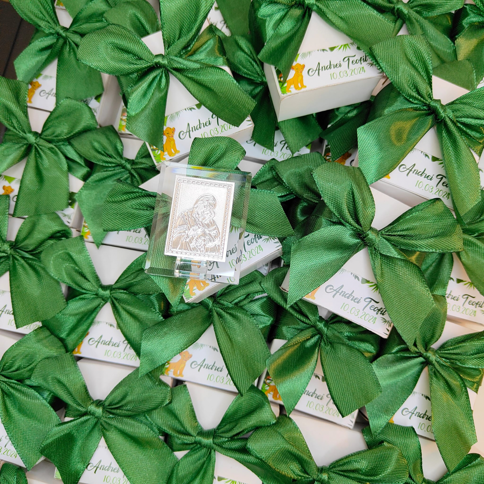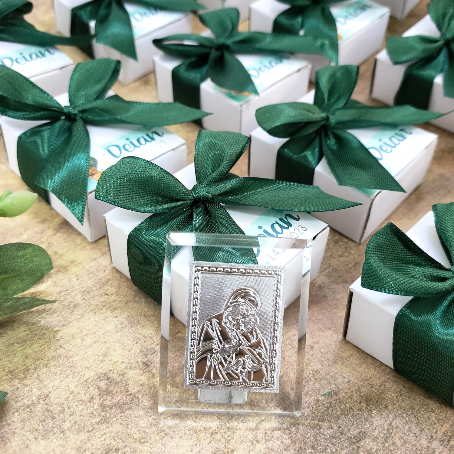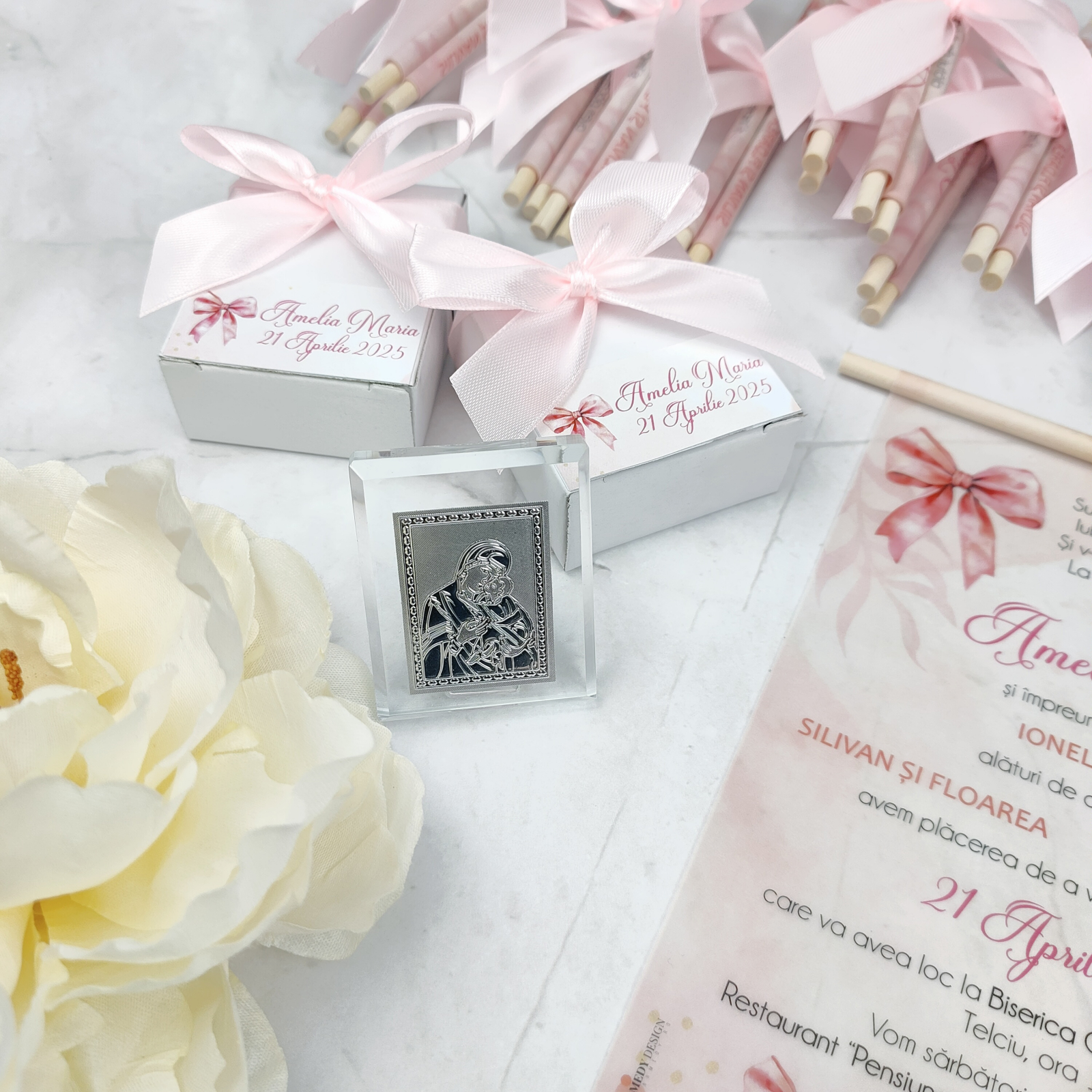 Iconitele vin ambalate intr-o cutie alba, pe care se lipeste o eticheta cu datele evenimentului (numele bebelusului / mirilor si data evenimentului), accesorizate cu funda (culoarea este la alegere - roz pal, verde, albastru, crem, mov si rosu).